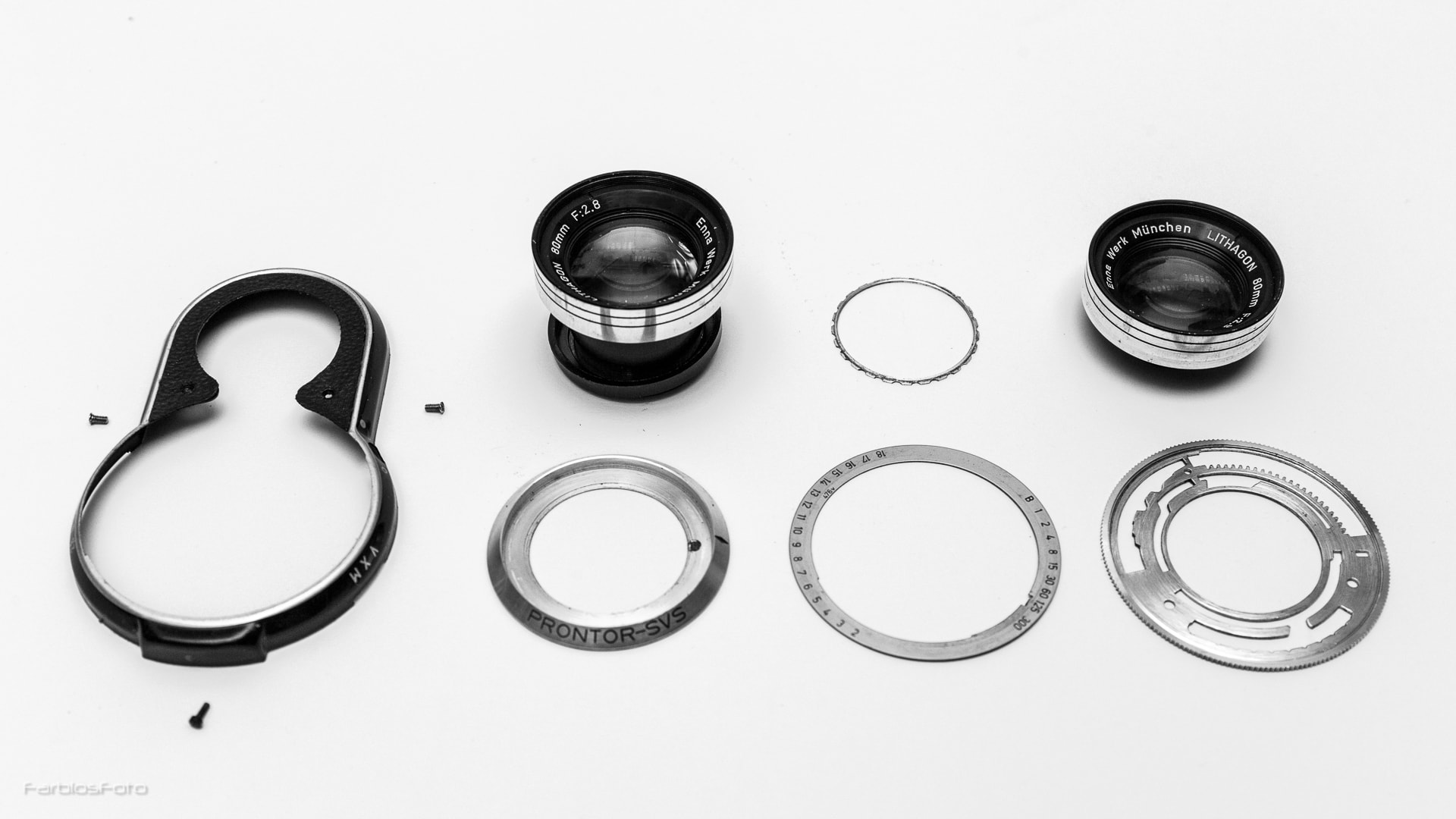 Das die Objektive nur geschraubt sein können, liegt eigentlich auf der Hand. Anders als bei der Rolleiflex, springt einem die Erkenntnis förmlich ins Auge. Mit mittlerem Kraftaufwand ließen sich die beiden Optiken lösen und herausdrehen. Jetzt gibt es zwei Möglichkeiten des weiteren Vorgehens. Entweder es werden die 3 Schrauben der Abdeckung ( die mit den Blendenzahlen) entfernt und diese wird dann ein bisschen trickreich abgenommen oder man entfernt als nächstes den Haltering, der die Einstellscheibe der Verschlusszeit festhält. Ich habe auch erst den Haltering und die Einstellscheiben abgebaut. Auf dem Foto sieht es jedoch so aus, als wäre die Abdeckung zuerst abgebaut worden. Das liegt daran, dass ich die Fotos erst beim Zusammenbau gemacht habe. Mein Tip: Erst die Einstellscheiben abbauen.